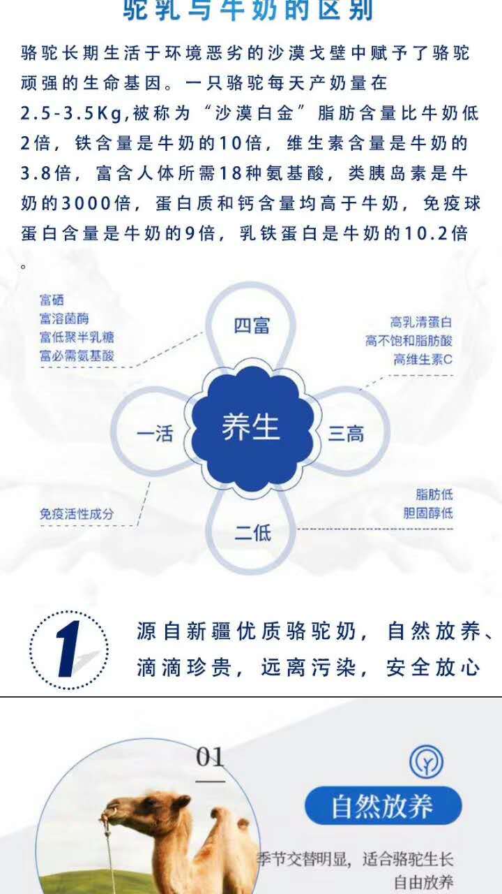 ️乳糖不耐受人群福音(駱駝不含過敏源,駝奶乳糖含量極低) ️糖尿病人一定要喝的奶(每毫升富含52個微單位的胰島素因子) ️有助于小朋友生...
