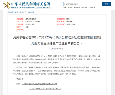 2018年12月29日海關(guān)總署于官網(wǎng)頒布了第220號《關(guān)于公布準(zhǔn)予延續(xù)注冊的進口嬰幼兒配方乳品境外生產(chǎn)企業(yè)名單的公告》,梳理一下這個備受行業(yè)矚目的更新,有以下值得關(guān)注。 審批...