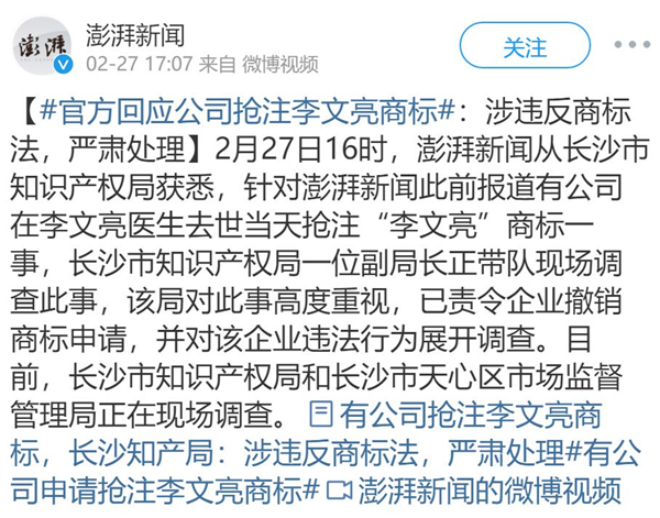 前不久發(fā)生一件惹眾怒的事:李文亮醫(yī)生才去世,就有公司當(dāng)天搶注“李文亮”商標(biāo)。 這是人干的事嗎? 2月27日,長沙市知識產(chǎn)權(quán)局責(zé)令企業(yè)撤銷申請,并且已...