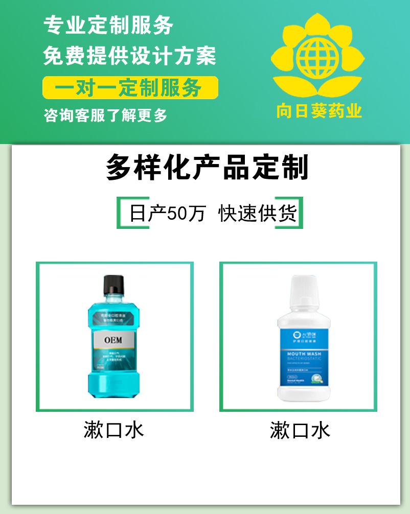 漱口水代加工定制-OEM生產廠家定制口腔門診/微商/電商/直播渠道南京向日葵藥業可提供漱口水oem代加工:抗菌漱口水、抗敏感漱口水、清新口氣漱口水、櫻花酵素漱口水、果香味漱口水等等...