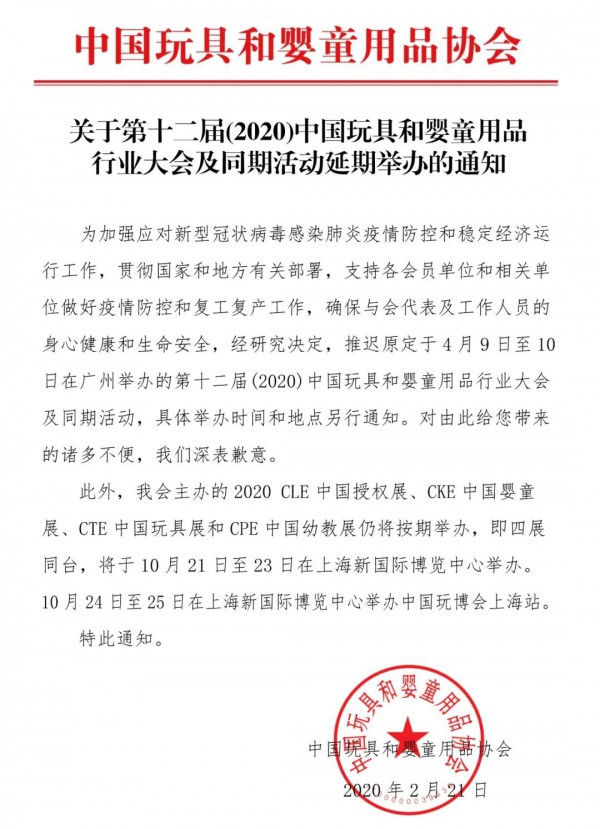 鑒于目前疫情防控和穩定經濟運行工作的要求,經研究決定,推遲原定于4月9日至10日在廣州舉辦的第十二屆(2020)中國玩具和嬰童用品行業大會及同期活動。通知全文如下:...