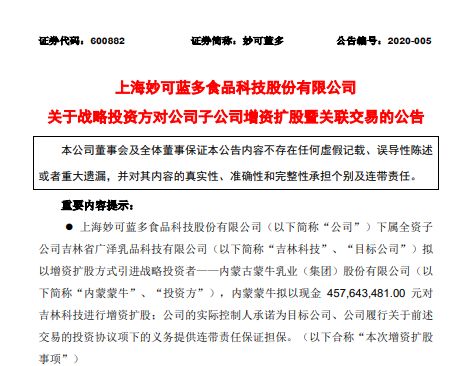 2020年國內第一宗食品巨頭收購案,主角仍是去年連番買買買的蒙牛! 剛剛,在上交所上市的上海妙可藍多食品科技股份有限公司(簡稱“妙可藍多股份”)發布公...