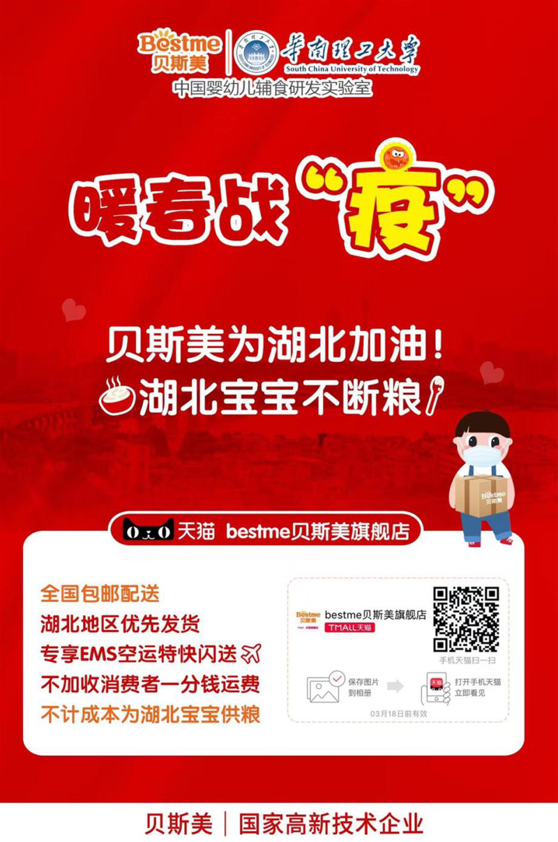當前,新型冠狀病毒肺炎疫情防控進入關鍵時期,受交通管制,物流不暢等因素影響,武漢地區的很多家庭出現嬰幼兒口糧告急的情況! ∽鳛閮炠|輔食品牌,貝斯美一直致力于守護嬰幼兒健康,希...