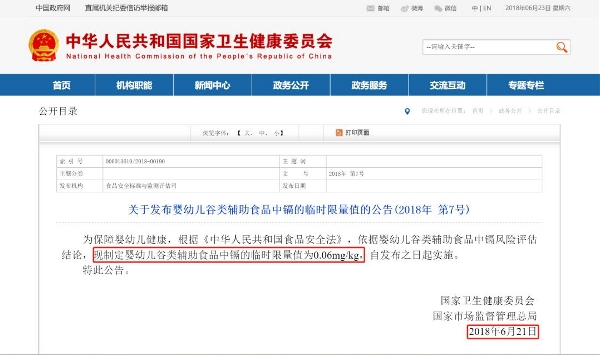 現原文轉載如下: 為保障嬰幼兒健康,根據《中華人民共和國食品安全法》,依據嬰幼兒谷類輔助食品中鎘風險評估結論,現制定嬰幼兒谷類輔助食品中鎘的臨時限量值為0.06mg/kg,自...
