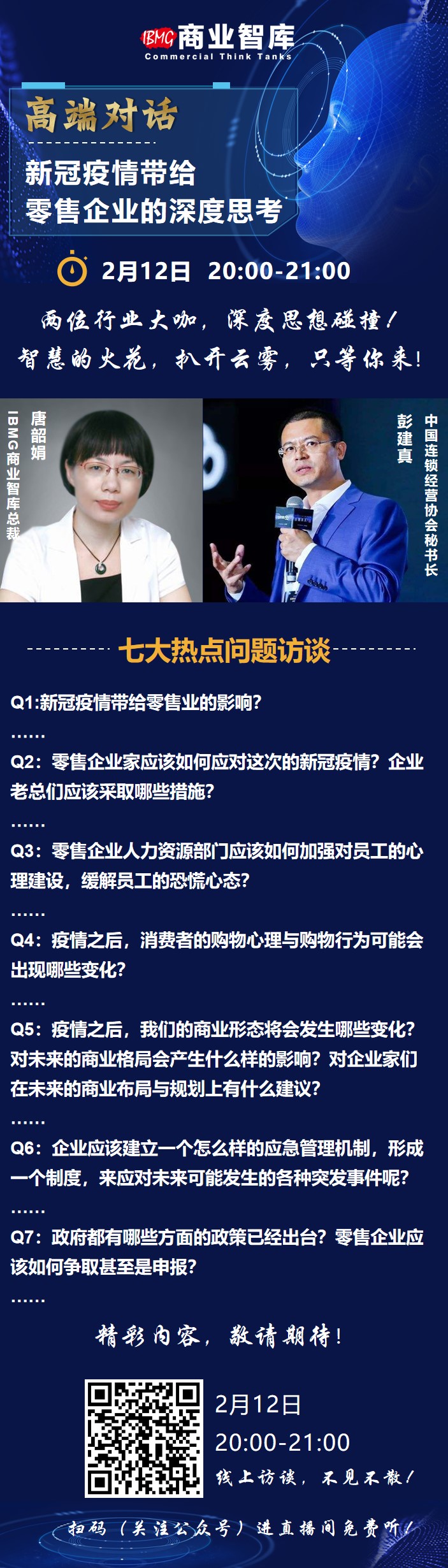 2月12日晚20:00-21:00,IBMG商業(yè)智庫總裁唐韶娟女士將對話中國連鎖經(jīng)營協(xié)會秘書長彭建真先生,就當下行業(yè)面臨的機遇與挑戰(zhàn),從行業(yè)政策解讀,消費變化,應(yīng)急預(yù)案,業(yè)態(tài)布...