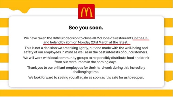 隨著全球疫情發展,為了遏制疫情持續擴散,越來越多的國家像我們學習,封城、停產、關門,“閉店狂潮”現已席卷全球各行各業。 01 多國關閉餐館 麥當勞...