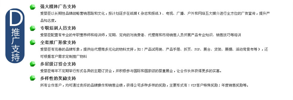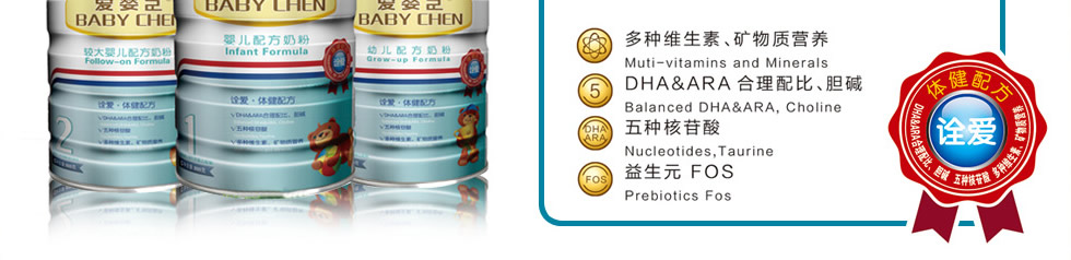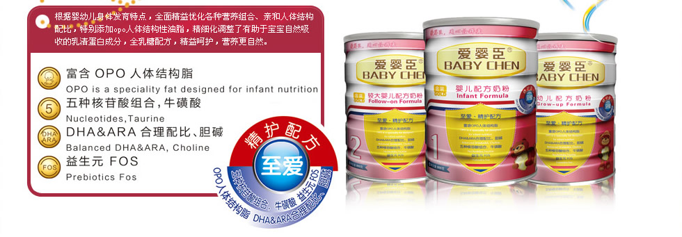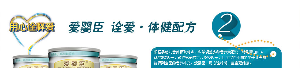 2014年,公司聯合多位著名兒科醫學專家及食品營養專家組成的嬰幼兒配方奶粉研發機構,參考聯合國糧農組織(FAO)/世界衛生組織(WHO) /食品法典委員會(CAC)所制定的推薦標準和中國配方奶粉食品安全國家標準,根據中國寶寶生長發育特征和需求,在原有品牌基礎之上,隆重推出具有中國寶寶專屬品質的愛嬰臣嬰幼兒配方奶粉“至愛?精護配方”和“詮愛?體健配方”兩大系列產品,并將為中國父母提供更專業的科學喂哺和育嬰服務。 真正做到:我們有誠信,讓您更滿意!