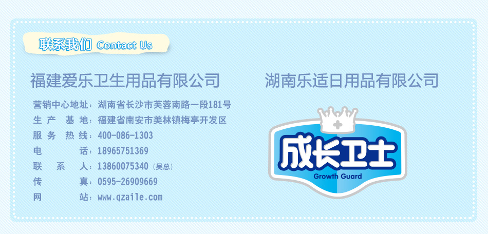 湖南樂適日用品有限公司于2012年成立,并于2013年初與愛樂衛(wèi)生用品有限公司結(jié)成戰(zhàn)略合作伙伴關(guān)系,共同致力于“成長衛(wèi)士”品牌的打造。通過“為未來而來”的創(chuàng)新運營模式打造“成長衛(wèi)士”親和友善、年輕活力、聰明睿智的品牌內(nèi)涵。憑借產(chǎn)品差異化及優(yōu)良的性價比,以獲未來長遠的發(fā)展。隨著不斷豐富的產(chǎn)品組合以及將會逐步擴大的網(wǎng)絡,“成長衛(wèi)士”將為期待未來美好生活的消費者提供更多選擇和生活享受。