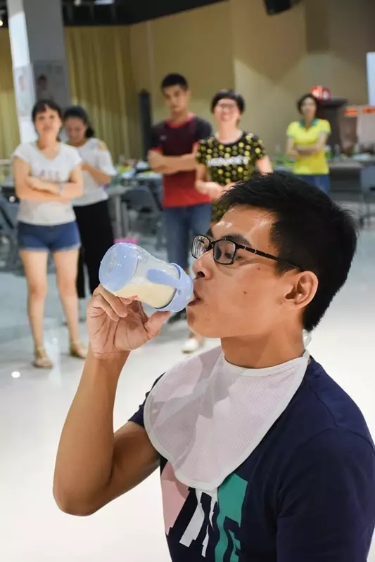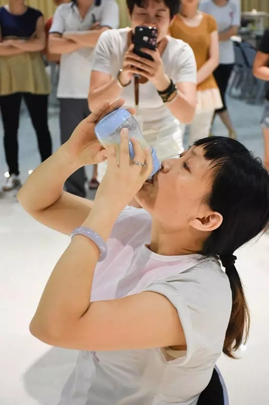 分工合作———同心協力 整理妝容,稍事歇息。隊員在組長的分配下各司其職,完成一系列任務。“吹爆氣球”、“用奶瓶喝奶”、“蒙眼剝吃雞蛋”、“邊搖呼啦圈邊唱歌”、“用臉夾氣球”,過程中隊與隊之間互相鼓勵和吶喊。