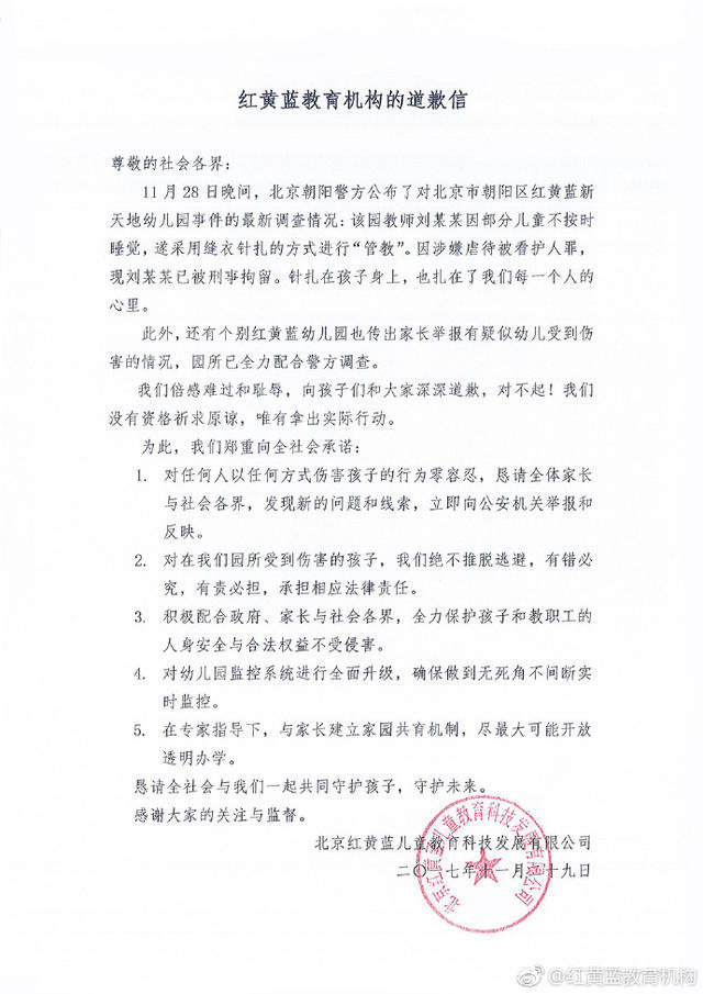 尊敬的社會各界: 11月28日晚間,北京朝陽警方公布了對北京市朝陽區紅黃藍新天地幼兒園事件的最新調查情況:該園教師劉某某因部分兒童不按時睡覺,遂采用縫衣針扎的方式進行“管教”。因涉嫌虐待被看護人罪,現劉某某已被刑事拘留。針扎在孩子身上,也扎在了我們每一個人的心里。 此外,還有個別紅黃藍幼兒園也傳出家長舉報有疑似幼兒受到傷害的情況,園所已全力配合警方調查。 我們倍感難過和恥辱,向孩子們和大家深深道歉,對不起!我們沒有資格祈求原諒,唯有拿出實際行動。 為此,我們鄭重向全社會承諾: 1. 對任何人以任何方式傷害孩子的行為零容忍,懇請全體家長與社會各界,發現新的問題和線索,立即向公安機關舉報和反映。 2. 對在我們園所受到傷害的孩子,我們絕不推脫逃避,有錯必究,有責必擔,承擔相應法律責任。 3. 積極配合政府、家長與社會各界,全力保護孩子和教職工的人身安全與合法權益不受侵害。 4. 對幼兒園監控系統進行全面升級,確保做到無死角不間斷實時監控。 5. 在專家指導下,與家長建立家園共育機制,盡最大可能開放透明辦學。 懇請全社會與我們一起共同守護孩子,守護未來。 感謝大家的關注與監督。 北京紅黃藍兒童教育科技發展有限公司 二〇一七年十一月二十九日 ![]() |