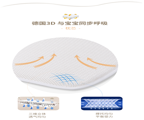 澳貝兒專為0-6歲寶寶設(shè)計睡眠系列產(chǎn)品,所有產(chǎn)品均采用3D立體中空材料作為產(chǎn)品的主要原材料,是嬰童枕全水洗的倡導(dǎo)者,讓寶寶徹底遠(yuǎn)離螨蟲和病菌的傷害。并且根據(jù)每個階段寶寶生長發(fā)育對于枕頭的需求不同,度身定做。枕芯選用來自德國工藝的3D立體高分子睡眠材料,可全身水洗,并且容易晾干, 清洗360度無死角,枕頭抗菌防螨,透氣性好,也稱為全水洗,會呼吸的枕頭,是寶爸寶媽為寶寶選擇枕頭的首選。