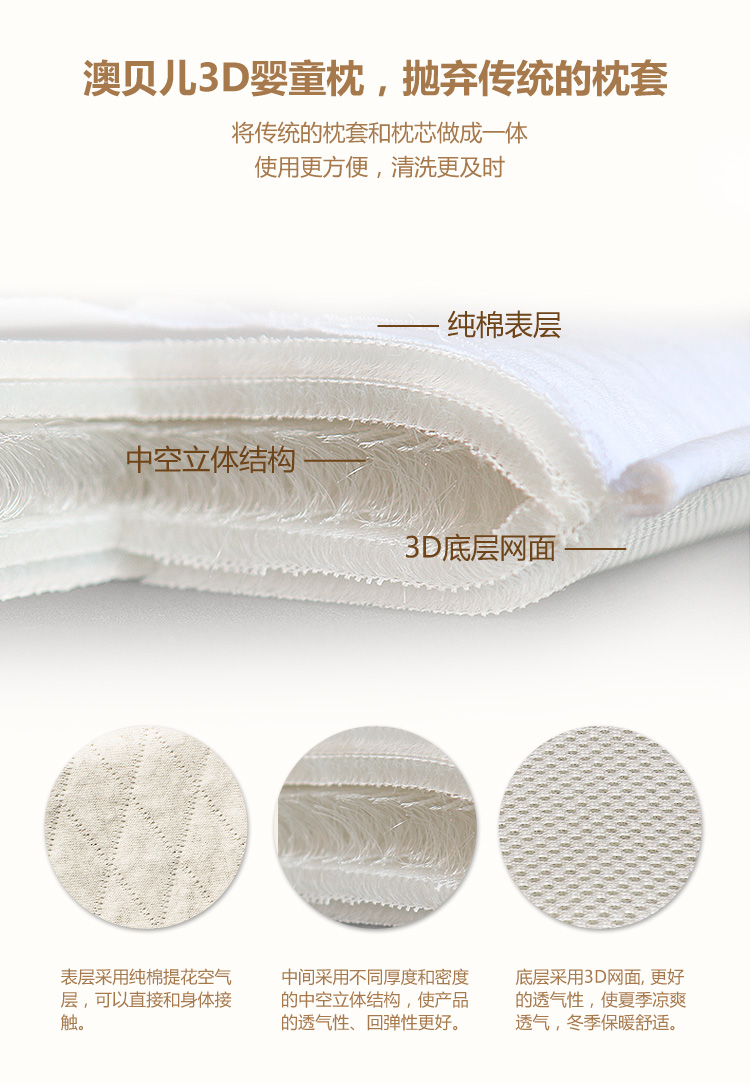 4. 安全可靠,科澳貝兒全水洗3D嬰童枕科學的將枕芯和枕套做成一體,使用更方便,清洗更容易。表層采用雙層全棉空氣層,可直接和嬰幼兒皮膚接觸,對皮膚無刺激和過敏等現象,吸濕性更強,透氣性更好,柔軟且舒適度好,讓寶寶安睡一整夜。澳貝兒3D嬰童枕也時刻確保您的寶寶在睡眠或者躺臥時的安全,產品源于一個簡單的創意和獨特的設計,網狀穿孔的高科技原料,可以均勻支持寶寶頭部的全部重量,簡單并有效,從而避免了扁頭綜合癥的發生,對于已經產生變形的寶寶,澳貝兒嬰兒枕頭可以幫助更快的矯正畸形,我們采用的是特殊的面料,對您的寶寶100%安全。 |