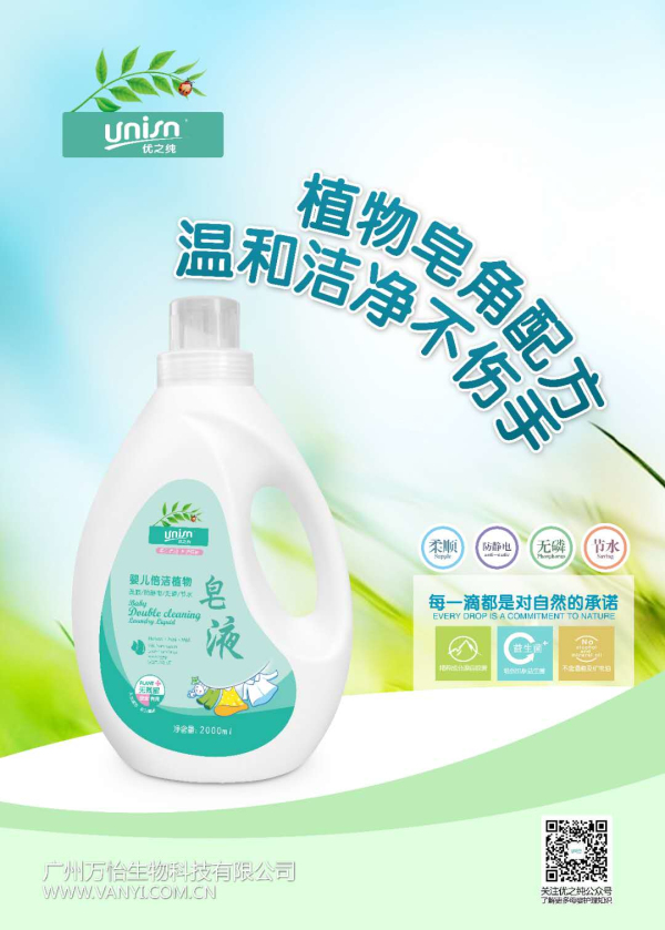 優之純嬰兒倍潔植物皂液 PH值接近中性,溫和清潔。快速清除奶漬、果漬等多種附著有害物質,泡沫細膩溫和,易沖洗。不添加熒光增白劑、漂白劑、磷等有害物質,洗后無殘留,安全無毒,可生物分解。