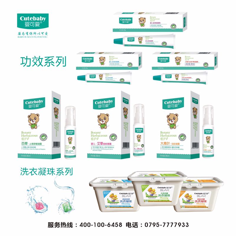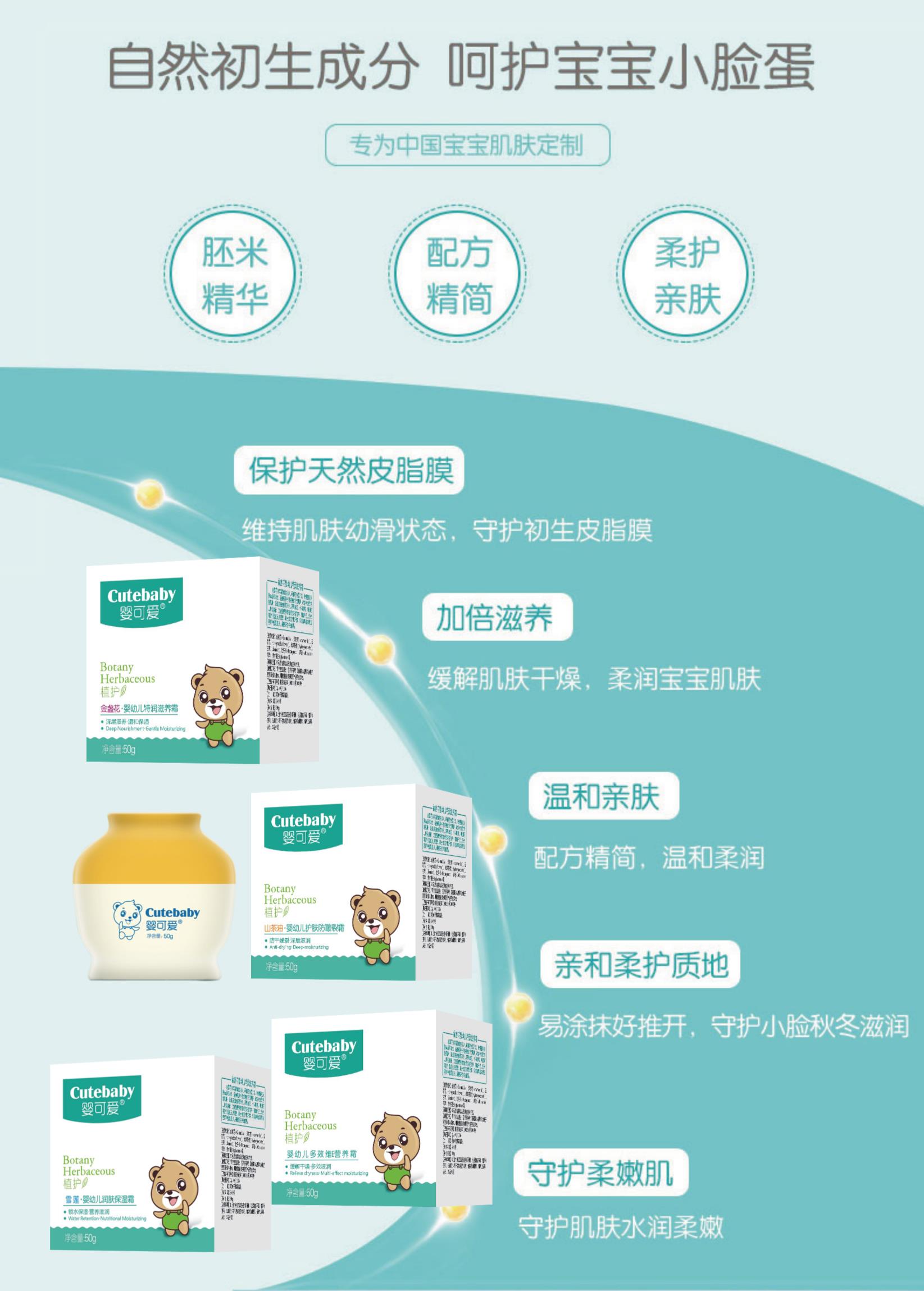 嬰可愛系列產品萃取天然植物精華,融合科學的生產技術和安全潔凈的生產環境,經嚴格的皮膚測試精制而成,為寶寶家庭提供“天然、安全、健康”的優質產品和全面的育兒指導。公司以國際化管理模式,用心制造讓媽媽放心的產品,力求打造最優質的嬰幼兒(功能性)洗護,(功能性)修復用品。