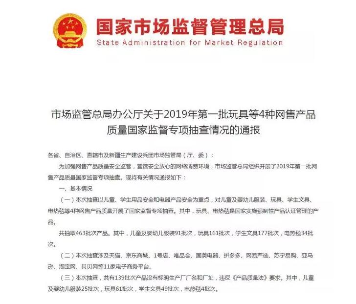 昨日,市場監管總局辦公廳公布了關于2019年第一批玩具等4種網售產品質量國家監督專項抽查情況的通報顯示,抽查以兒童、學生用品安全和電器產品安全為重點,對兒童及嬰幼兒服裝、玩具、學生文具、電熱毯等4種網售產品質量開展了國家監督專項抽查。其中,玩具、電熱毯是國家實施強制性產品認證管理的產品。