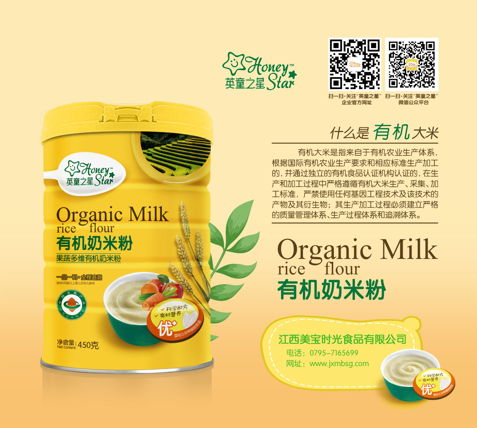英童之星有機奶米粉有果蔬多維、鐵鋅鈣、益生菌、益生元四大配方,在生產過程中嚴格遵循生產標準,經過多道工序,層層把關,科學配比營養素,原來哦優質,品質精優,專業更科學,給寶寶健康的成長呵護;順滑細膩的口感,百吃不膩,清淡的口味蘊含淡淡的奶香,營養均衡,是添加輔食人群的理想選擇!