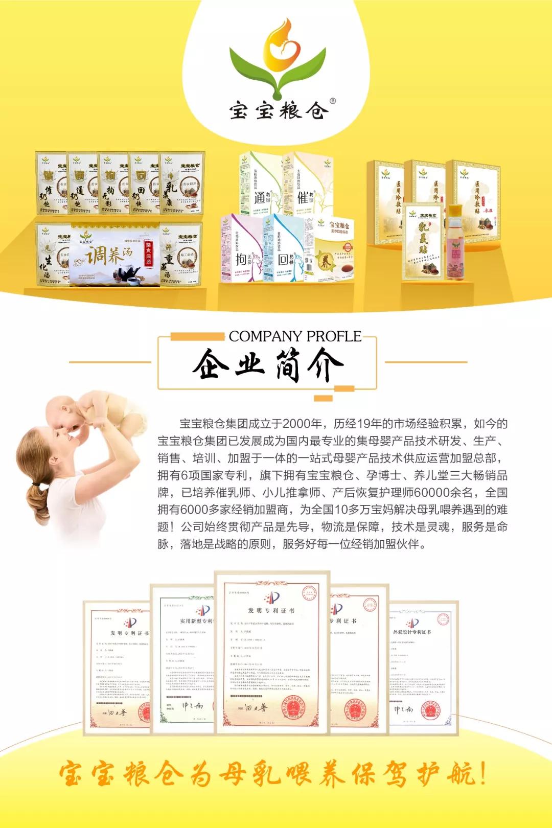 創(chuàng)辦于2000年的寶寶糧倉集團如今已經擁有6項國家專利,旗下?lián)碛袑殞毤Z倉、孕博士、養(yǎng)兒堂三大暢銷品牌,已培養(yǎng)催乳師、小兒推拿師、產后恢復護理60000余名,全國擁有6000多家經銷加盟商,為全國10多萬寶媽解決母乳乳喂養(yǎng)遇到的難題。開創(chuàng)至今,寶寶糧倉一直秉承著以客戶至上的發(fā)展宗旨,用不斷積累的成熟行業(yè)經驗,幫助更多有志之士共創(chuàng)健康行業(yè)的輝煌。寶寶糧倉期待社會各界人士的加盟與合作,攜手關愛母嬰健康!