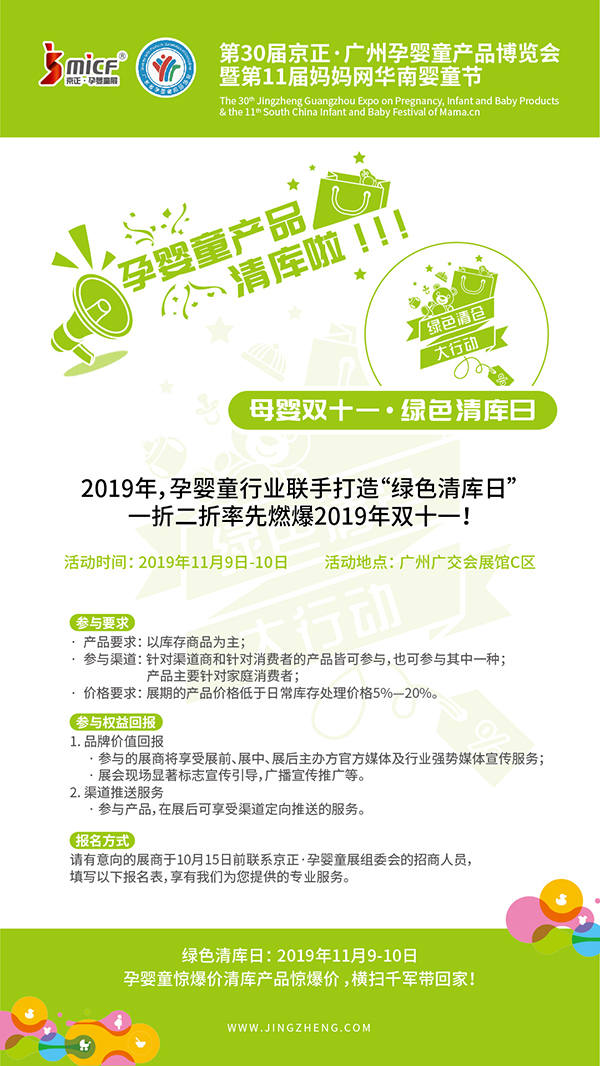 新零售時代,機遇與挑戰并存。目前孕嬰童行業面臨的產能過剩、庫存積壓等困境。為助力企業擺脫困局,第30屆京正·廣州孕嬰童產品博覽會暨第11屆媽媽網華南嬰童節開展期間,主辦方京正國際特別策劃針對廠商清理庫存的“母嬰雙十一·綠色清庫日”活動。 本次活動旨在攜手各大品牌參展商清減不必要的庫存,加快企業現金流周轉,同時深度開拓華南地區的渠道市場,實現企業、渠道商、終端消費者和平臺的多贏格局。 本次活動的參與對象僅針對第30屆京正·廣州孕嬰童展的參展商,本次活動時間為11月9日、10日兩天。參與活動的產品以庫存商品為主,參展商以優惠的價格讓利給消費者,打造針對家庭消費者的線下雙十一購物狂歡節。為了讓參展商實現真正讓利給消費者的同時,又能夠達到集中清倉的效果,本次活動期間產品價格將低于日常庫存處理價格的5%—20%。 搭設平臺,為行業服務,是京正國際永遠不變的宗旨。凡是參與本次活動的參展企業,主辦方京正國際將為其帶來品牌價值回報和產品的渠道的定向推廣服務。展前、展中、展后,主辦方官方媒體及行業強勢媒體將對參與展商的產品進行集中宣傳推廣服務,展會現場顯著標志宣傳引導、廣播宣傳推廣,展后還可享受渠道定向推送服務。 本次活動提報截止時間為10月16日,有意向參與的展商請于此前聯系京正·孕嬰童展組委會的招商人員,填寫活動報名表,享有我們為您提供的專業服務。 更多活動信息請關注京正孕嬰童展官方微信、官方微博 活動時間:2019年11月9日-10日 活動地點:廣州廣交會展館C區 報名截止時間:10月15日