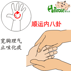 清脾經:用左手捏住孩子的手,右手指腹循大拇指側邊緣向掌根方向直推。 順運內八卦:內八卦在手掌面,以掌心為圓心,以掌心到中指根橫紋處距離的2/3為半徑,做圓圈形按揉。