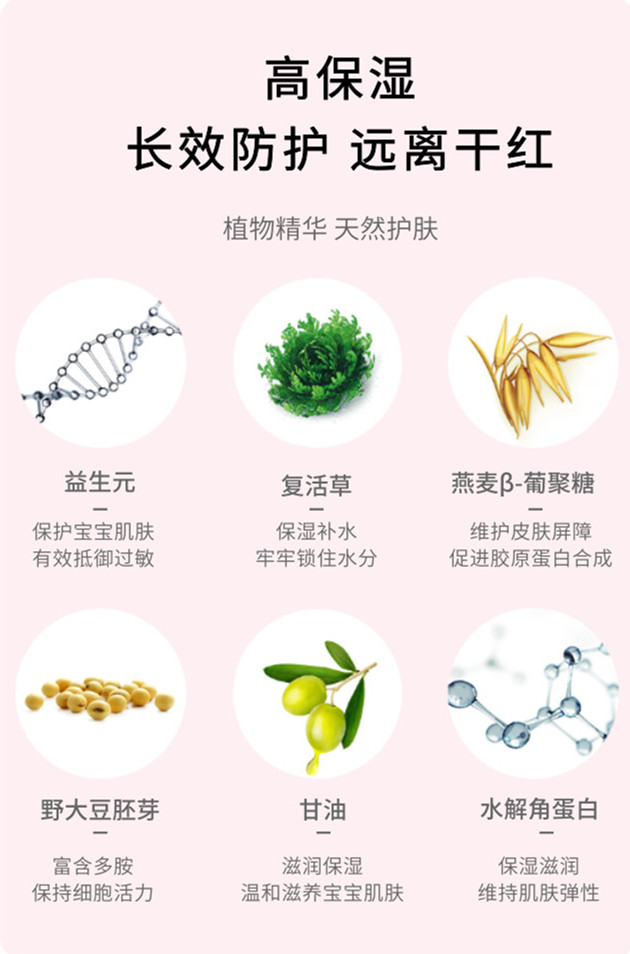 2.植物精華,天然護膚 這款面霜是純植物成分,不僅含有機燕麥這個國際公認的護膚成分,還含有日本野大豆胚芽精華、復活草精華,這兩個都是進口成分,有加倍保濕鎖水的功效,滋潤度超高。特別適合氣候干燥的北方寶寶使用。