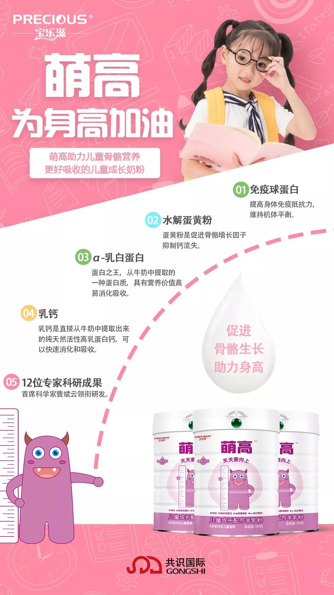 根據(jù)3-15歲兒童人群的生理特點和營養(yǎng)需要,在奶粉營養(yǎng)成分和配方上,曹斌云教授為萌高系列特別添加了乳鈣、免疫球蛋白、水解蛋黃粉、α乳白蛋白等,以起到促進(jìn)孩子骨骼增長,提高身體免疫力及腸胃吸收消化能力的作用。
