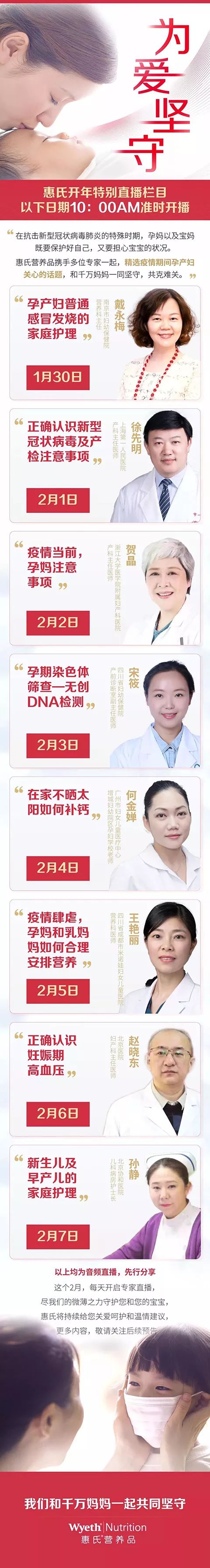 “新型冠狀病毒”疫情的發展一直牽動所有人的心,惠氏營養品第一時間緊急成立了“緊急領導小組”,在這次不同尋常的挑戰面前,和所有合作伙伴一起,全力以赴提供安全健康優質的服務給媽媽和寶寶。從1月24日開始,惠氏營養攜手平安好醫生,免費提供N95口罩。通過設立的24小時服務熱線,為所有醫護工作者提供力所能及的服務與支持。 母嬰行業是充滿愛的行業,這也是惠氏營養品始終不變的堅守。惠氏營養品進入中國三十多年來,與多個政府機構、社會公益組織以及行業協會通力合作,積極開展各項企業公民計劃,以實際行動踐行對中國和媽媽們的承諾。惠氏營養品密切關注兒童和孕期婦女的健康和發展,關注職場孕期職場媽媽,關心鄉村留守兒童,通過各項慈善捐贈項目支持婦女兒童的健康、教育和發展。 “惠澤基金”由中國紅十字基金會和惠氏營養品聯合發起,計劃從2019到2021三年期間,累計投入超過1000萬元的資金,致力于媽媽和寶寶早期1000天的營養健康和發展。除了本次抗擊“新型冠狀病毒”的捐贈,惠氏營養品將繼續關注婦女兒童健康,攜手全國人民,一起打贏這場防疫戰。 15場專家公益講座 解答關于媽媽和寶寶的話題 作為特殊群體,孕媽以及寶媽既要保護好自己,又要擔心寶寶的狀況,如何解決媽媽們在疫情當下的焦慮?怎么樣在足不出戶的情況下,可以有效給與媽媽和寶寶權威有效的信息? 惠氏集結20名權威專家,覆蓋兒童保健、營養、產前診斷、兒童護理等多個領域,針對母嬰群體,涉及眾多話題,包括疫情當前如何防護嬰幼兒;孕產婦的心理減壓練習;孕產婦普通感冒發燒的家庭護理;在家不曬太陽如何補鈣;疫情肆虐,孕媽和乳媽如何合理安排營養;疫情當前,孕媽注意事項;疫情時期,孕婦發熱的須知等。 系列講座從正月初四開始,目前已確認舉行15期,課程內容將持續更新,覆蓋整個農歷正月。