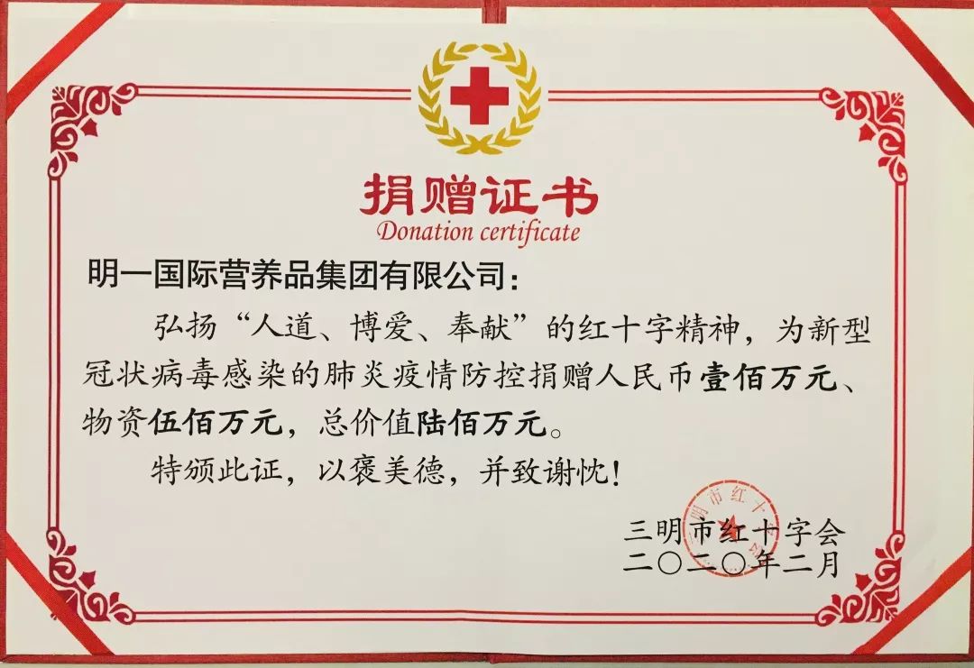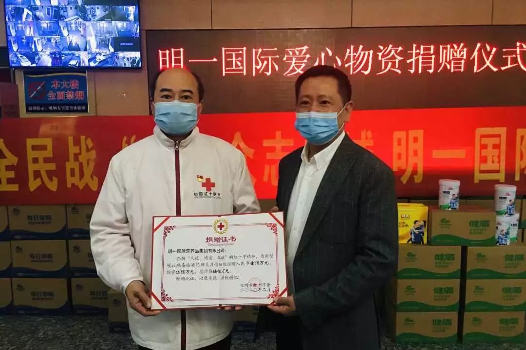 2020 全民戰疫 疫情無情,人間有愛。明一國際為支援新型冠狀病毒肺炎疫情防控工作,協助打贏這場疫情防控狙擊戰,向福建省三明市紅十字會捐出六百萬元的現金和物資,其中一百萬元現金用于購買緊缺物資,另外,捐贈價值五百萬元的益生菌、奶粉等營養品,讓一線的醫務人員的安全得到保障,保持良好的身體狀態,令這一場肆虐的疫情盡快得到遏制!