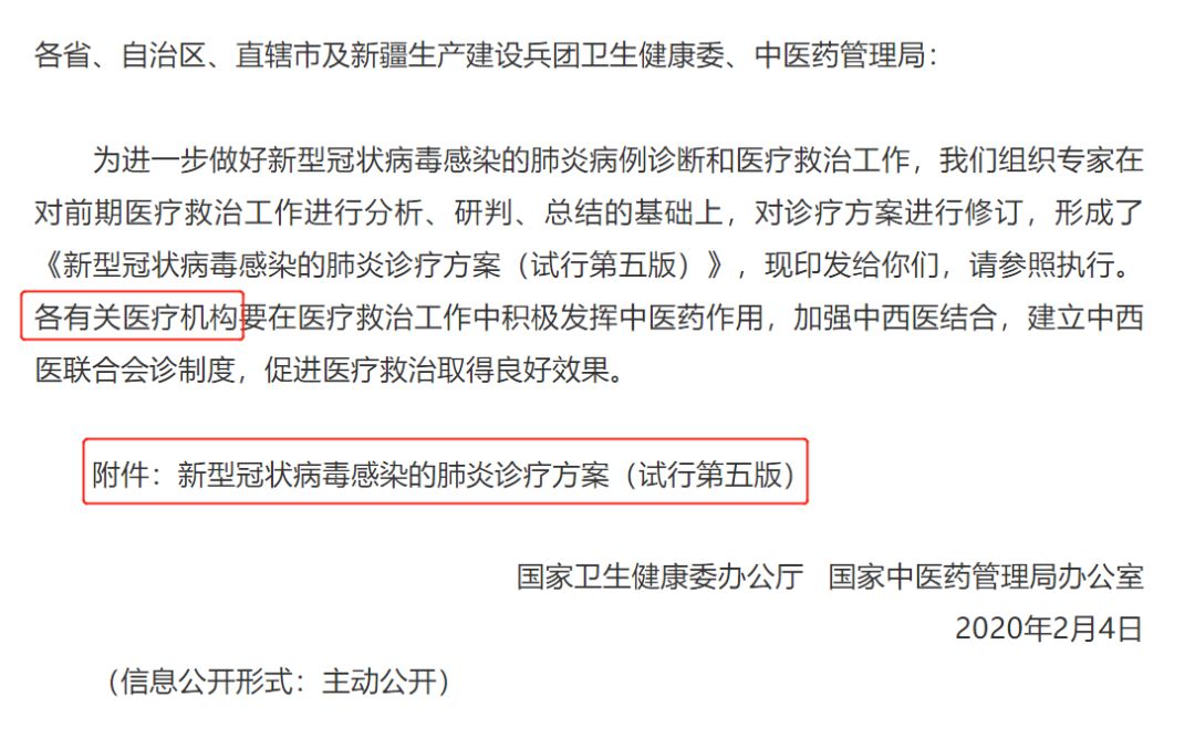 這是沿用了診療方案(試行第四版)。在第三版中還沒有做出相關的表述。 這里有兩個關鍵字“診療”“試行”。 就執行對象而言,這個文件的發布是衛健委向省市各級衛健委、中醫藥管理局傳達最新的醫療救治研究成果,執行單位是各有關醫療機構。 就可信度而言,這個方案目前是“試行”,意味著具體有沒有功效還需要實踐檢驗。而要想試錯成本最小,必須專業機構和人士推動,有確切成果再推廣,也不遲。