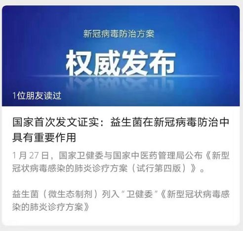 說回正題,益生菌對新冠病毒防治具有重要作用,怎么來的? 在新型冠狀病毒感染的肺炎診療方案(試行第五版)中,有這樣一句話,“可使用腸道微生態調節劑,維持腸道微生態平衡,預防繼發細菌感染。”