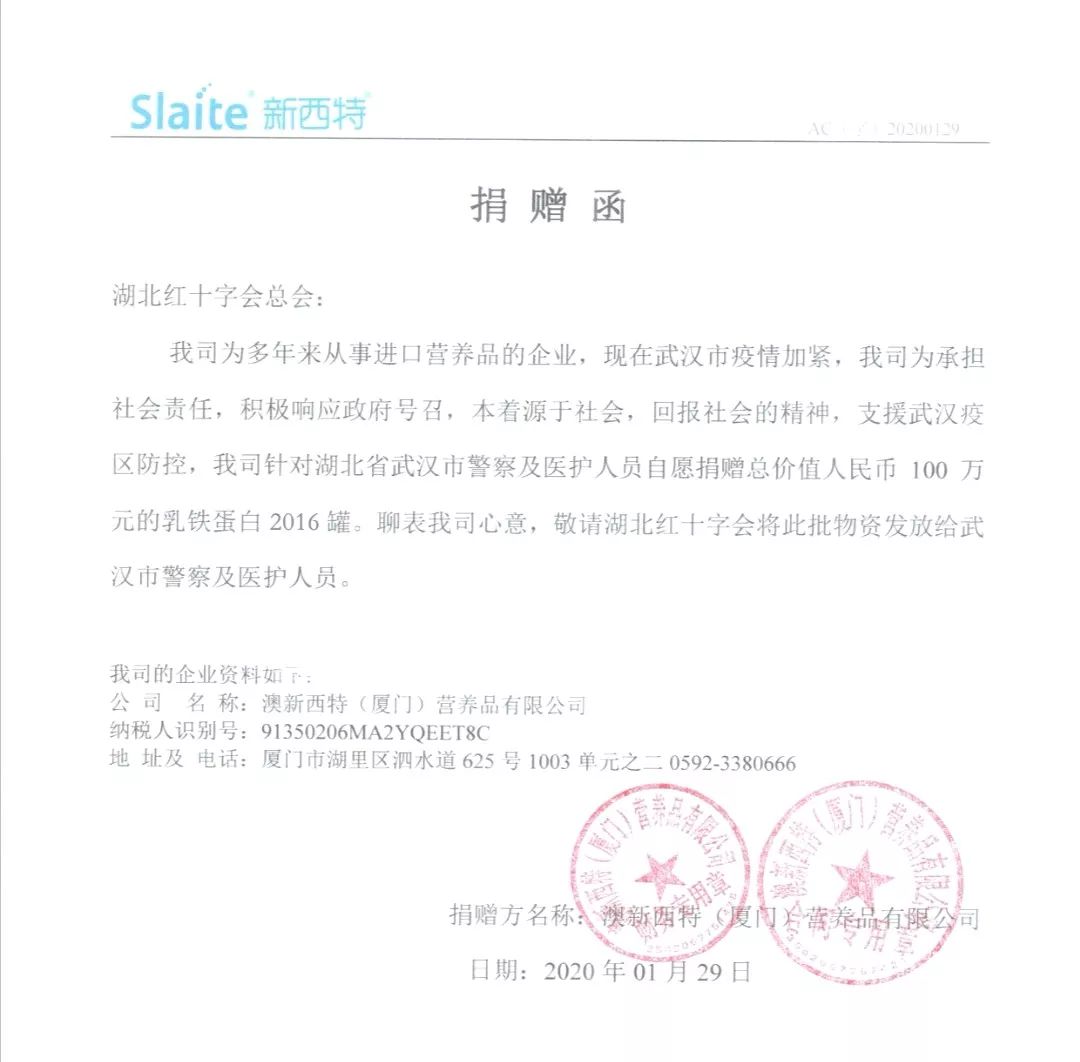 作為營養品企業,新西特能做什么呢? 2月1日,澳新西特(廈門)營養品有限公司積極響應,向湖北紅十字會總會捐贈營養物資—100萬元乳鐵蛋白調制乳粉,用于提供一線工作人員的營養補充,支持疫情防控工作,為奮戰在一線的人們提供更多后援保障工作。