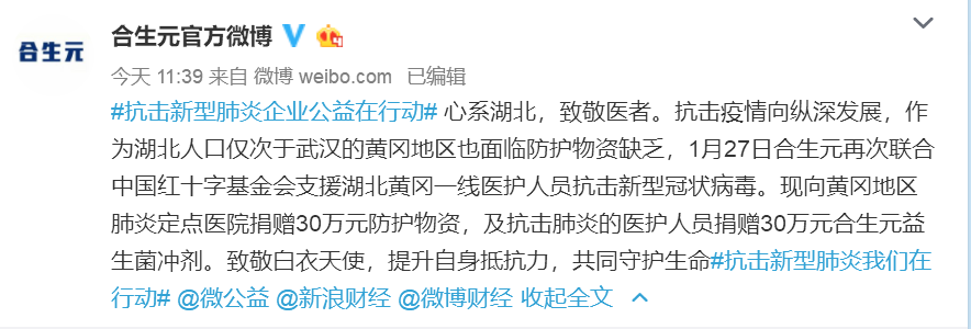 海王捐贈1700多批防疫物資 為保證廣佛兩地的海王星辰門店能向廣大市民提供充足的防疫物資,1月22日,廣東海王醫藥集團物流配送部動員全體車輛及員工,分10趟次,向廣州和佛山(桂城和大良)兩地22家海王星辰藥店運送500多箱醫用口罩;1月23日,分20趟次,運輸了包括口罩、洗手液、乙醇消毒水、抗病毒口服液、體溫計、板藍根、維生素C和連花清溫膠囊等1700多批防疫物資。 湯臣倍健捐款1000萬元用于抗擊新冠肺炎疫情 1月27日,湯臣倍健股份有限公司通過中華慈善總會捐款1000萬元,在其機構內下設“抗擊新冠肺炎專項救助資金”,用于抗擊新冠肺炎疫情一線醫護人員的救助和獎勵以及醫療防護物資采購。 惠氏營養品捐贈款物總價值2700萬元 全力支援抗擊新型肺炎疫情
