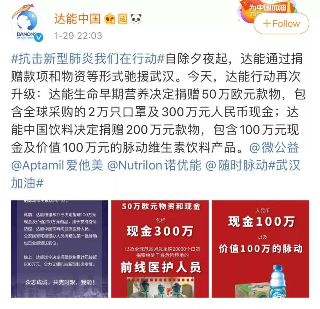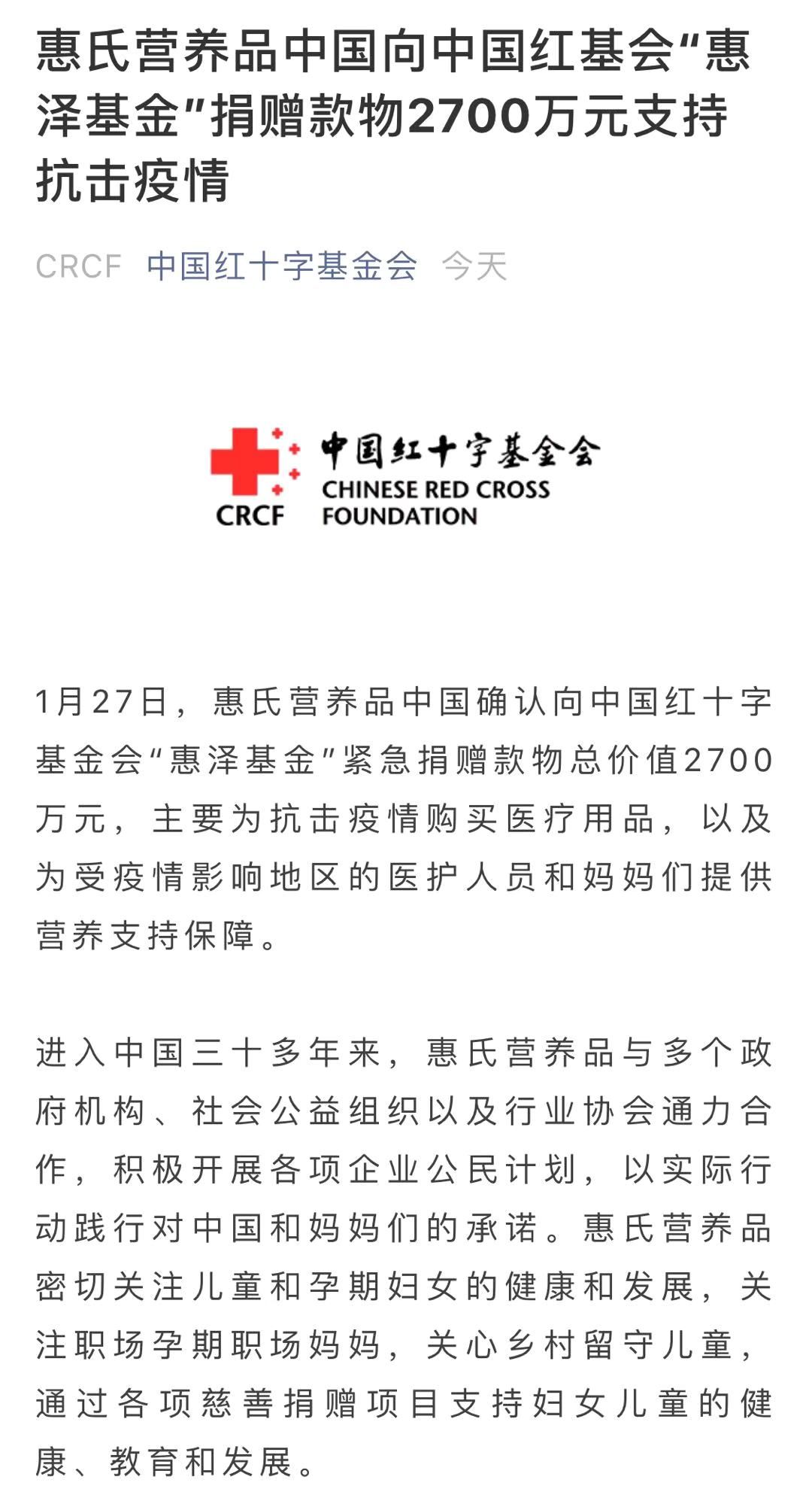 利潔時及旗下美贊臣捐助5000萬現金及物資 1月27日,美贊臣及滴露等知名品牌的母公司利潔時集團宣布,現正密切與中國和武漢衛生健康系統及慈善機構聯系,捐贈消毒必需物資和現金,為抗擊新型冠狀病毒感染肺炎疫情提供支持。 疫情爆發之初,利潔時曼倫已向醫療系統捐贈了價值人民幣60萬元的滴露消毒防護物資,以緩解武漢當地醫院清潔消毒的需求。目前,利潔時正與有關方面密切聯系,跟進了解疫情防護工作的最新需要,并積極調配全球資源,加大對抗擊疫情的支持力度。新一輪的捐贈包括緊急籌措的價值人民幣2000萬元的消毒物資,和人民幣現金3000萬元。有關現金捐贈將用于支持勤洗手等良好衛生習慣的推廣和普及,降低病毒通過手部接觸進一步傳播的可能。 雅培捐贈1810萬現金和物資 1月28日,雅培中國宣布向中國紅十字基金會和湖北省疾病預防控制中心捐贈總額1,810萬人民幣的現金和醫療物資,專項用于支援武漢新型冠狀病毒引發的肺炎疫情的防控工作。 雅培中國的捐贈包括:價值1,350萬人民幣的雅培醫學營養產品全安素和特殊膳食用營養基粉、價值150萬人民幣的雅培全自動生化分析儀(ARCHITECT c8000 System)、價值100萬人民幣的雅培i-STAT手持式血液分析儀,以及210萬現金捐款, 將根據醫院一線醫護人員的需求,用于采購亟需的防護服、口罩、消毒液等醫療防護用品,幫助醫護人員更加安全地救治病患。 菲仕蘭捐贈500萬元抗擊疫情,守護兒童和家庭健康 1月31日,菲仕蘭宣布通過中國婦女發展基金會捐贈500萬元人民幣現金和物資,用于支援抗擊新型冠狀病毒引發的肺炎疫情及后續防控工作。 銀橋集團捐獻500萬現金及物資 1月28日,西安銀橋乳業集團通過陜西省紅十字會為新型冠狀病毒肺炎疫區捐贈資金物資500萬元,這是銀橋乳業繼27日為西安交大一附院彬州市中醫醫院捐贈牛奶、28日為臨潼區一線醫護人員等送去牛奶后的第三次捐贈活動。 和氏乳業集團捐贈物資1000余萬元用于抗擊疫情 1月29日,和氏乳業集團向陜西省紅十字會捐贈物資1000余萬元。和氏乳業本次捐贈的1000余萬元物資均為和氏旗下配方羊奶粉,為奮戰在抗擊疫情一線的醫護工作者和受疫情困擾的廣大市民送去慰問和關愛。 美力源乳業捐贈100萬元現金,專項支援武漢疫情防控 1月28日,陜西美力源乳業向中國紅十字基金會捐贈100萬元現金,專項用于支援新型冠狀病毒感染肺炎疫情的防控。 妙可藍多捐贈100萬元奶酪助力醫務工作者抗擊疫情