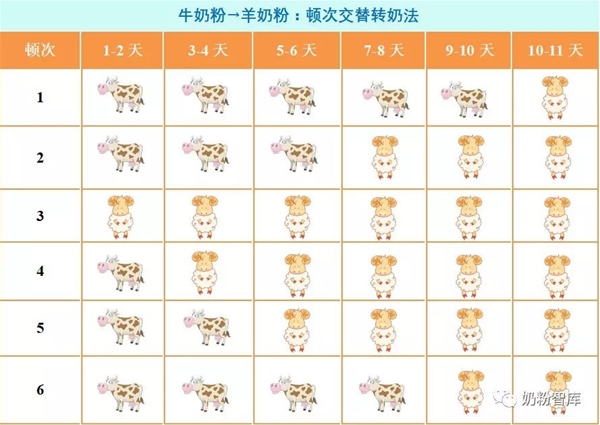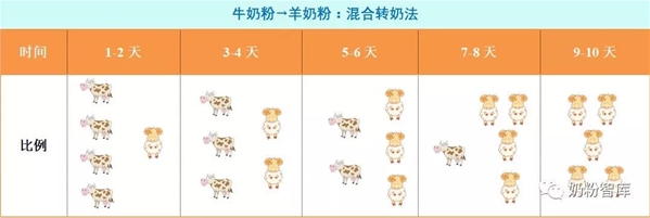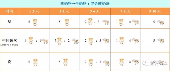 2、羊奶粉→牛奶粉 轉奶優勢:受氣味影響較小 一般牛奶粉奶香清幽,正常情況下沒有什么不討喜的氣味。不過也有部分寶寶對羊奶的哪種氣味“情有獨鐘”,若是遇到轉奶期間拒絕吸奶,也可以采用混合轉奶法。早晚兩餐先不急著加牛奶,當轉到一半時開始添加牛奶。可參考下表(以一次5勺為例):