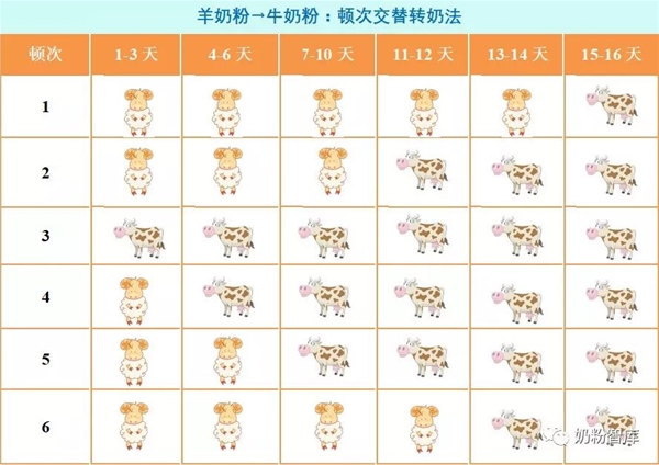 不管是牛奶還是羊奶,都有比較悠遠的人類使用史,鮮奶營養成分也存在著一定的差異,為了滿足寶寶的營養需求,會模擬母乳成分生產配方奶粉。從營養配比上,他們的差異也會被縮小,但是各自的特點并不會完全消失。所以不管是牛轉羊,還是羊轉牛都需要采用合適的轉奶方法,才可讓寶寶更順利地適應新奶粉。 我們分別來看看牛奶粉和羊奶粉之間的轉奶方法。 1、牛奶粉→羊奶粉 轉奶優勢:相對牛奶好消化 據目前研究顯示,羊奶的蛋白質分子和脂肪球顆粒比牛奶小得多,消化吸收相對更好,在胃腸適應方面降低了轉奶的難度。有的寶寶從牛奶到羊奶,不需要逐漸轉奶也能適應,不過一般情況下有過渡期,更方便寶寶適應新奶粉,通常采用頓次交替轉奶法(以一天6餐為例):