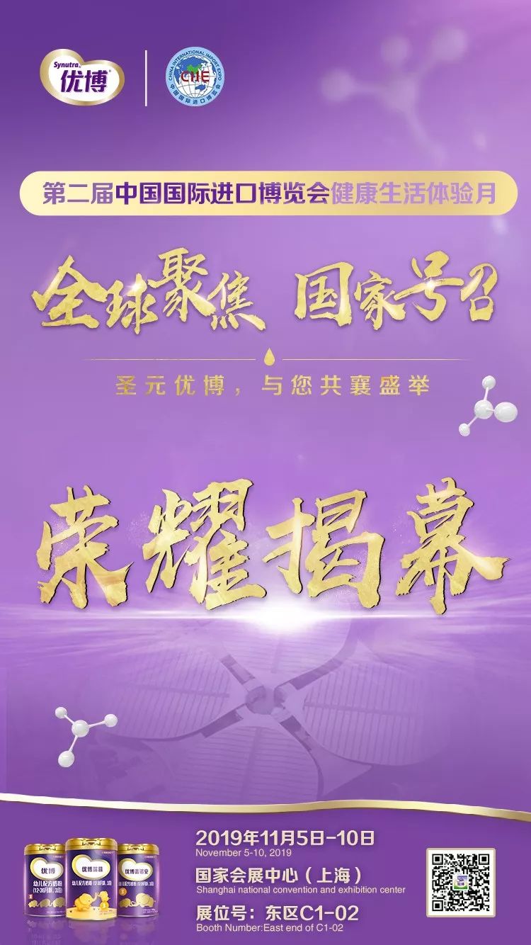 11月5日,“2019第二屆中國國際進口博覽會”在上海國家會展中心盛大開幕,來自全球150多個國家和地區的3000多家企業參與其中,一些國內外奶粉品牌也都齊聚在這里爭奇斗艷。其中,圣元優博也隆重亮相在中國國際進口博覽會“健康生活體驗月”活動上,展館(東區C1-02)以優博品牌色紫色為主,整體風格高端大氣又不失典雅。