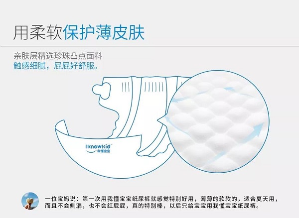 透 首先,我懂寶寶紙尿褲面層采用了熱風(fēng)無(wú)紡布特質(zhì)的珍珠凸紋面層,內(nèi)部透氣通道增加了30%的接觸面積,有利于氣流的通過(guò)和加速尿液的下滲。 其次,我懂寶寶紙尿褲底膜選用了微米級(jí)的防水全透氣PE膜,因?yàn)槲叶畬殞毱放频漠a(chǎn)品理念是“安全、純凈、無(wú)添加”,所以在產(chǎn)品底膜的設(shè)計(jì)上也不同于市面上其他產(chǎn)品,我們沒(méi)有花里胡哨的圖案和印花,畢竟印刷圖案多多少少都會(huì)含有一定量的油墨化學(xué)成分。我們的產(chǎn)品只有素雅干凈的全透氣底膜,潔白的底膜設(shè)計(jì)不僅增加了50%的透氣因子,而且相比傳統(tǒng)的透氣底膜更輕20%。保證了產(chǎn)品的透氣性,不滲漏。