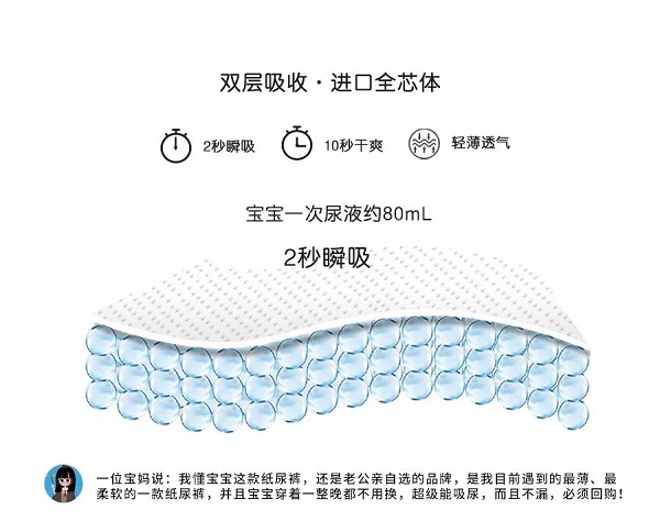 吸 我懂寶寶紙尿褲,芯體上層為日本進(jìn)口三大雅高分子吸水樹(shù)脂,三大雅高分子吸水樹(shù)脂具有鎖水功能強(qiáng)的特性,可以迅速吸收寶寶的尿液的同時(shí),使紙尿褲面層時(shí)刻保持干爽不反滲。下層為日本進(jìn)口住友高分子吸水樹(shù)脂,住友高分子吸水樹(shù)脂具有吸收速度快,導(dǎo)流性強(qiáng)的功能,可以迅速把上層三大雅吸收的尿液流通到整個(gè)芯體上,使尿褲不斷層、不起坨,并且達(dá)到寶寶一次尿量2秒瞬吸,10秒干爽的功能,使寶寶的屁屁時(shí)刻保持干爽。