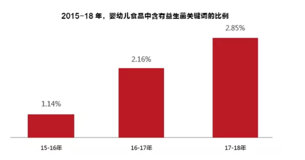 2、益生菌。京東消費數據顯示,59.3% 的中國消費者希望購買添加了益生菌的產品。2017-2018年間嬰幼兒食品中含有益生菌的產品相較于2015-2016年間,同比增長了250%。在京東電商上,消費者搜索的關鍵詞中,益生菌占比也名列前茅。同時,在2019全球母嬰大會上,英氏控股集團有限公司創始人萬建明也表示,“2018年益生菌增量達到嬰童營養品整體增量的45%,中國益生菌未來5 年能達到100%增長。”