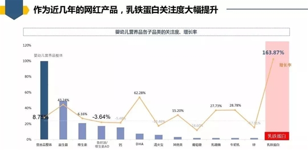 4、乳鐵蛋白。《嬰幼兒喂養品類近年的發展態勢如何》顯示,益生菌、維生素、魚肝油維生素、鈣是國內媽媽更為關注的品類。乳鐵蛋白雖然處于末位,但其關注度增長明顯,近三年年均關注度增長率高達163.87%,遠超其他分類。