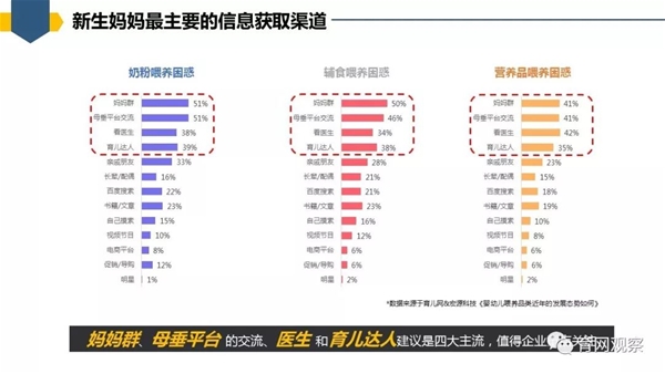 而無論是奶粉喂養、輔食喂養亦或是營養品喂養,媽媽們信息獲取的主要渠道是:媽媽群、母垂平臺的交流、醫生和育兒達人建議,這些都值得企業重點關注。