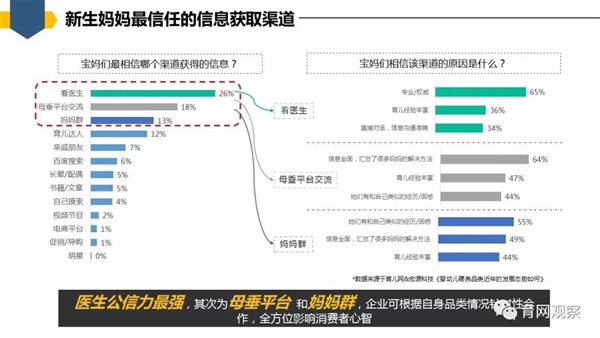 其中,新手媽媽最信任醫生,其次是母嬰垂直平臺和媽媽群。