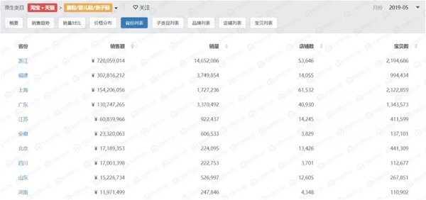 浙江、福建、上海,不變的前三甲,但差距懸殊 根據母嬰研究院數據顯示,我們發現了一個有趣的現象,2019年上半年,在店鋪所在省份銷售額排名中,浙江、福建、上海成為屹立不倒的前三甲,尤其是浙江省以絕對優勢占據榜首,縱向來看,雖然位列前三甲,但是銷售額之間的差距還是很明顯的,浙江高出福建1倍以上,福建高出上海將近1倍。浙江是制鞋、售鞋大省,下面的城市銷量中,溫州市也不負眾望,成為銷量最大的城市。