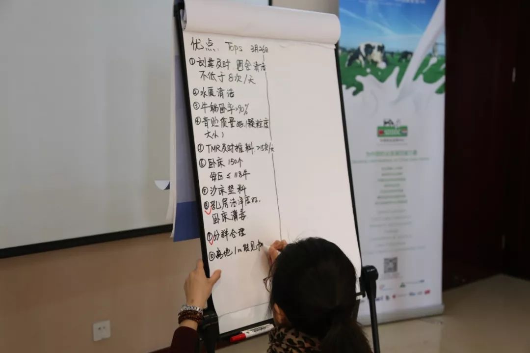 比如,上午學完擠奶流程和奶廳管理,下午就要去奶廳實戰了。一人幾張表格做DDA動態分析,包括牧場審查、趕牛方式分析、擠奶流程分析,乳頭末端情況等等,要靠自己的操作、觀察和詢問來獨立完成。看看乳頭,檢查下剩奶量,是不是很興奮呢? 而每次實踐后,學員們都會再次集合在一起——對答案!以小組的方式寫出結果,最后會由該課程的老師分享他的數據分析。 你以為這就結束了?不! 培訓班的“班主任”會讓學員憑借對奶廳觀察,依次談論該牧場在奶廳管理上的問題和優勢,根據自己的經驗談改善措施,頭腦風暴正式開啟!