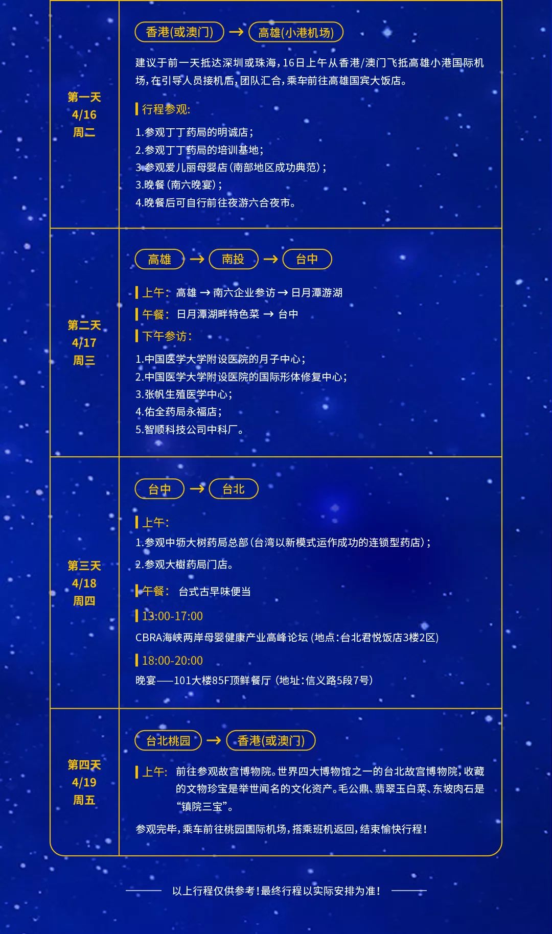為期四天的臺灣之行,我們將會參訪臺灣丁丁藥局、佑全藥局、大樹藥局等特色企業,與業內大咖共同探討行業發展新趨勢,共話母嬰零售新未來! 活動日程