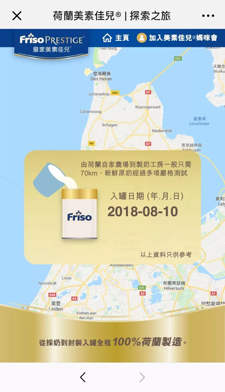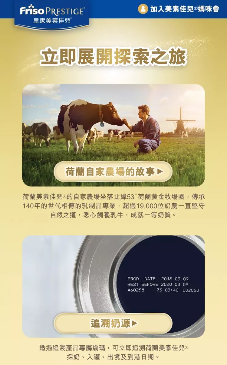 現在,歡迎大家去正規渠道購買美素佳兒奶粉,掃描罐頂二維碼,和我一起體驗Friso美素佳兒奶源追溯系統,走進荷蘭,探索美素佳兒的故鄉,領略黃金牧場的魅力,追溯嚴格透明的生產過程,見證美素佳兒從牧場到你家的嚴格把控,與信賴品質! |