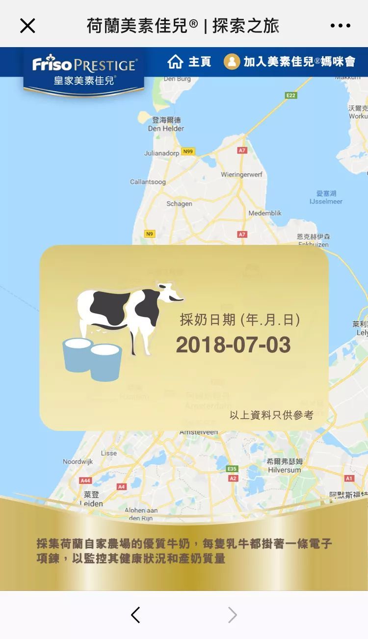 經過幾天不斷地種草拔草的討論后,閨蜜們紛紛感嘆養娃的不易,單是在選購奶粉這一點上就倒下了一大片寶媽,怎么感覺別人家買奶粉這么容易呢??就這幾天的討論大致總結了一些選購奶粉需要注意的事項,先分享給大家: 不要迷戀代購,一定要選擇正規的購買渠道。 新興的網紅小眾品牌要謹慎選擇,盡量選擇品牌歷史悠久,信譽度高的知名品牌。最好選擇奶源地位于“黃金奶源帶”的品牌,例如荷蘭。 劃個重點:安全!奶源!這是寶媽們都關注的一個因素。 嬰兒的腸胃無比脆弱,對于家長來說,奶粉的安全性和出產地就成了重中之重的關注點,但如何做到完全透明、放心,對很多寶媽來說尤其是新手媽媽卻并不容易。 就在群里討論地如火如荼的時候,一個閨蜜的突然造訪,說要帶我體驗一項高科技。閨蜜搬出了她寶寶一直在喝的港版美素佳兒,首先閨蜜讓我拿出手機,掃描罐頂那個“神秘”的二維碼,就進入了美素佳兒官網的奶源追溯系統,展開了我們的奶源探索之旅。