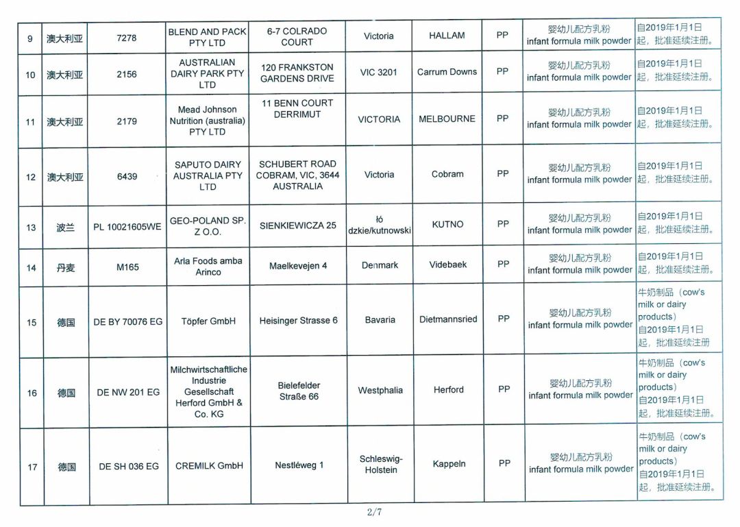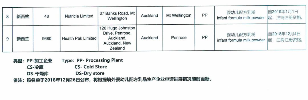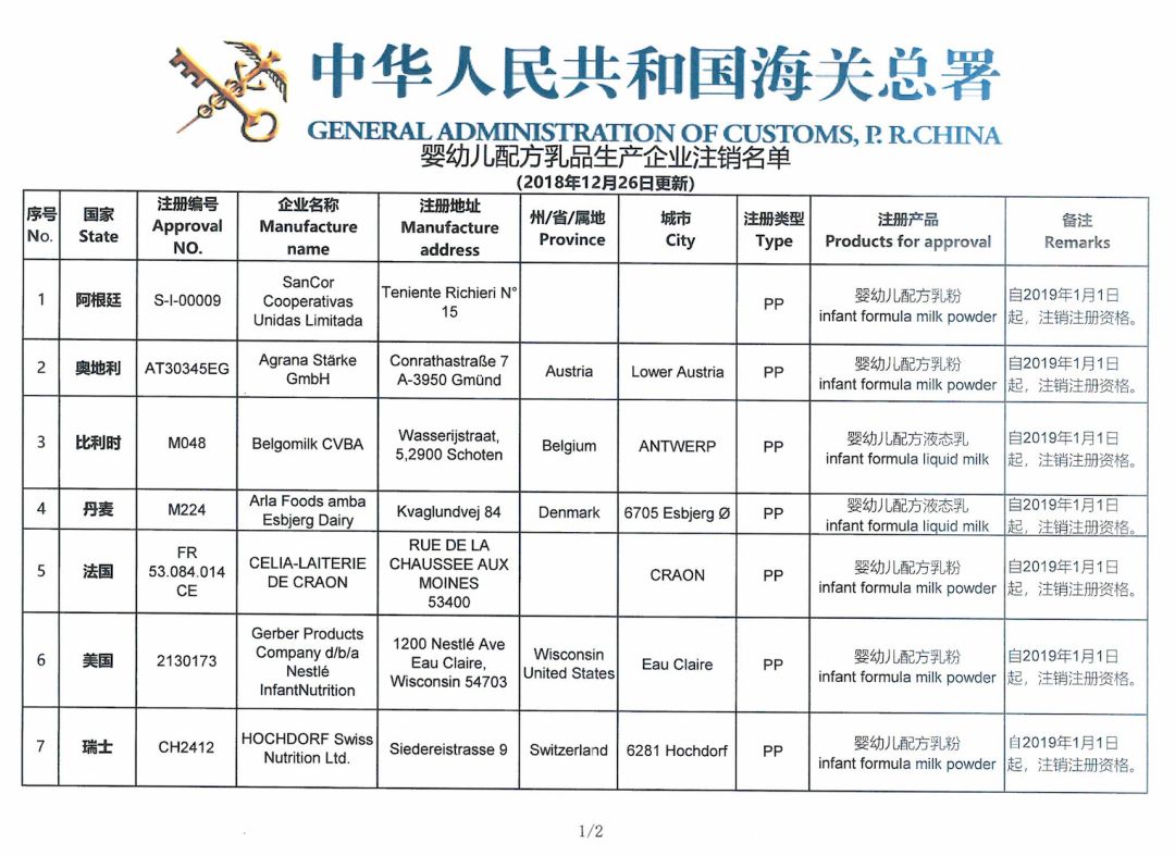 公告又指出,截至2018年底,注冊有效期屆滿,但未遞交延續注冊申請的進口嬰幼兒配方乳品境外生產企業9家,其注冊資格予以注銷,企業名單如下: