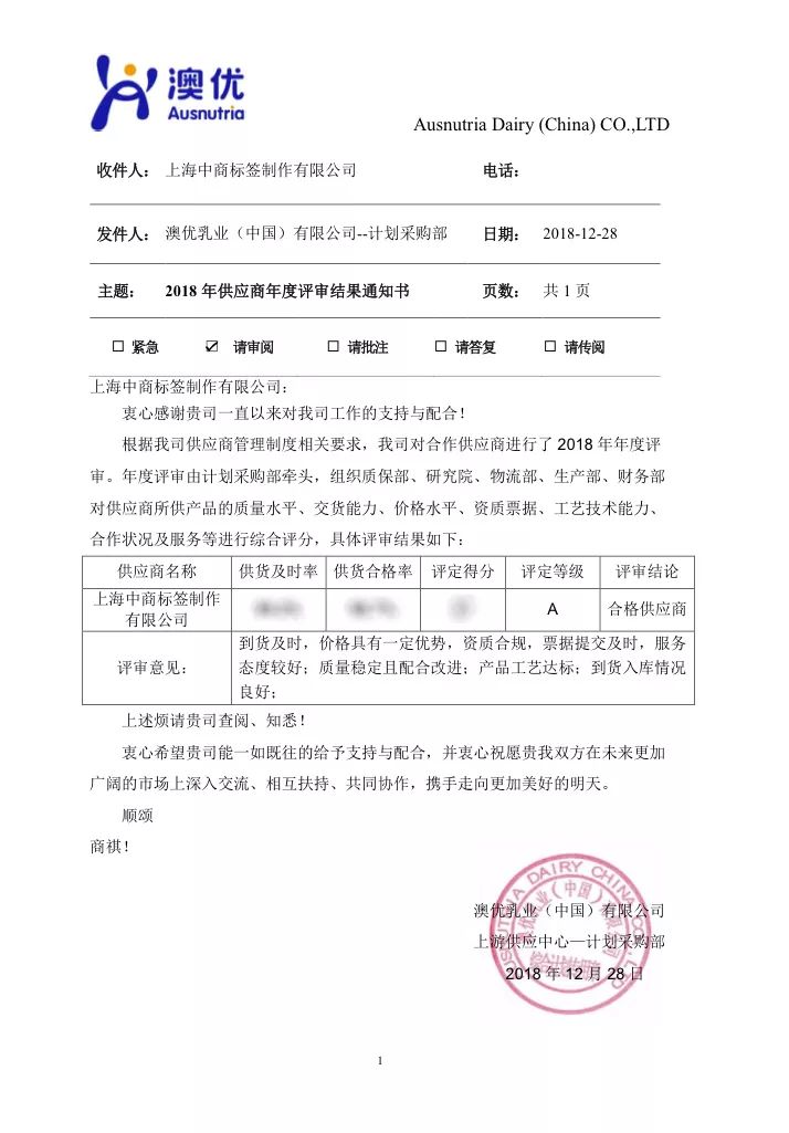 日前,澳優(yōu)集團(tuán)剛剛開展了2018年供應(yīng)商年度評審工作,該評審由澳優(yōu)集團(tuán)計劃采購部牽頭,組織質(zhì)保部、研究院、物流部、生產(chǎn)部、財務(wù)部對供應(yīng)商所供產(chǎn)品的質(zhì)量水平、交貨能力、價格水平、資質(zhì)票據(jù)、工藝技術(shù)能力、合作狀況及服務(wù)等進(jìn)行綜合評分,全方位考察供應(yīng)商的各方面服務(wù)水平。 在此次年度評審中,CCN中商憑借自身嚴(yán)格的管理體系和客戶服務(wù)精神,快速、順利地完成了澳優(yōu)集團(tuán)的評審,再次獲評A級供應(yīng)商,深受企業(yè)贊賞和信賴!(小編一定不會告訴你CCN中商也是澳優(yōu)集團(tuán)2017年度A級供應(yīng)商哦~)