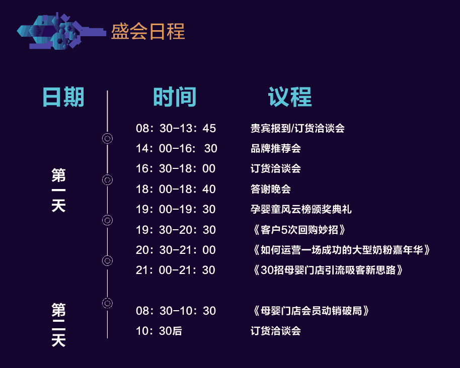 盛會(huì)看點(diǎn) 訂貨洽談——眾多知名廠家品牌展示,讓您零距離找到優(yōu)質(zhì)好產(chǎn)品 聽課學(xué)習(xí)——聆聽5大課程,提升經(jīng)營(yíng)方法,解 決經(jīng)營(yíng)難題 行業(yè)交流——500多家母嬰同行精英齊聚,交心交朋友營(yíng)造圈子 風(fēng)云榜單——揭曉2018-2019年度風(fēng)云榜單,定位發(fā)展方向 盛會(huì)特邀嘉賓