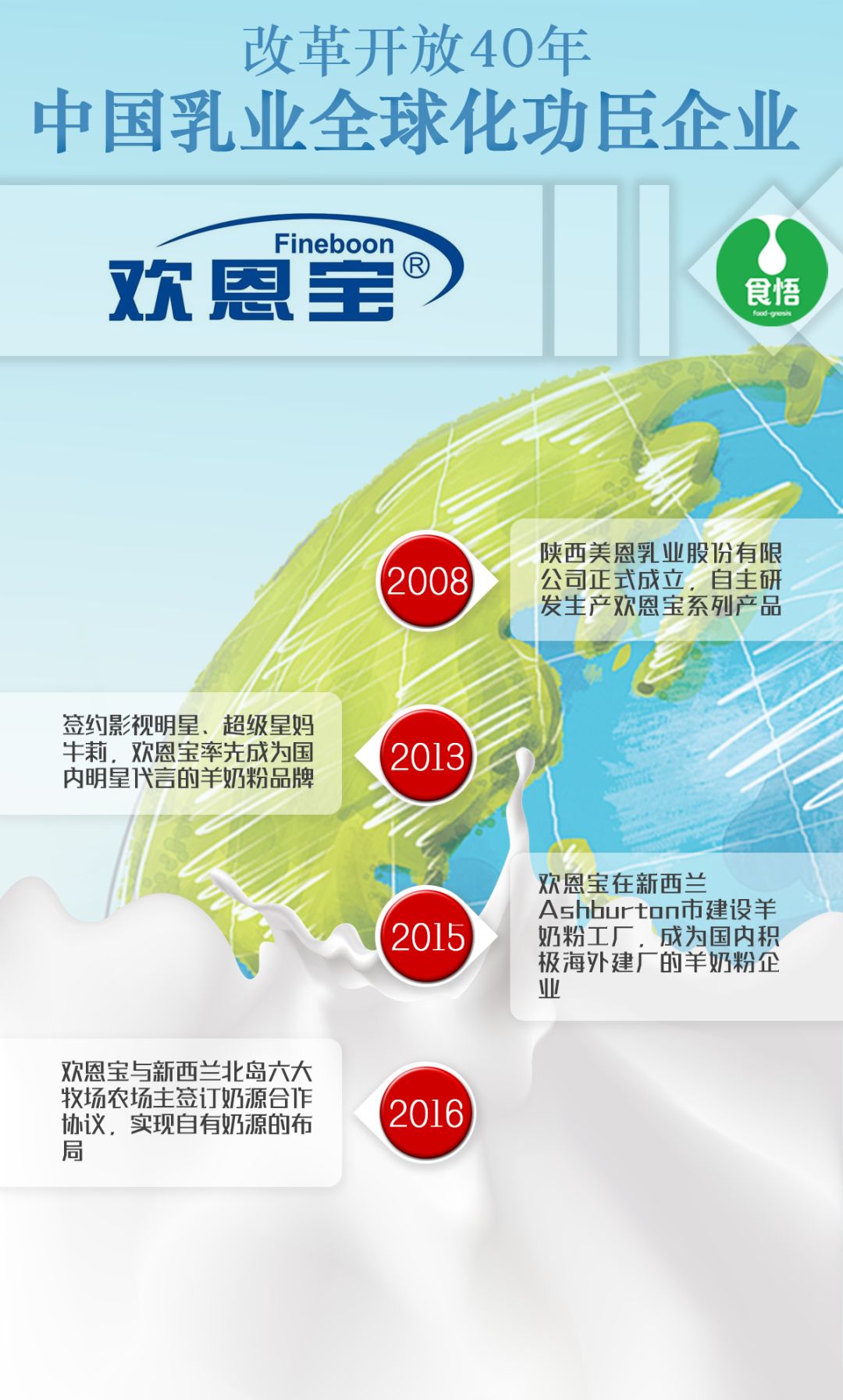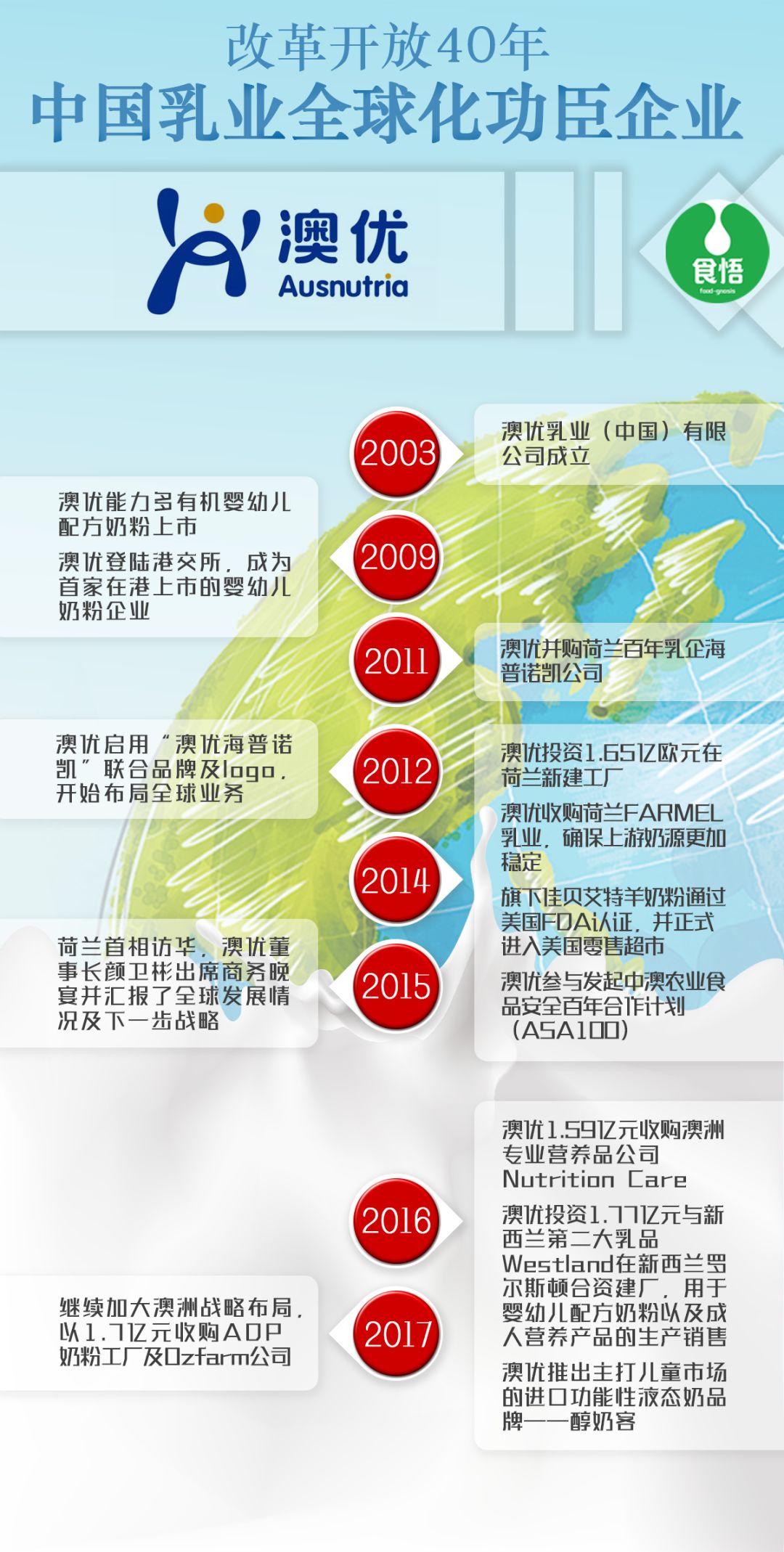 首先,讓我們致敬40年前率先喊出“開放”的那位領導人:鄧小平。 如果當初不改革不開放,估計當今買牛奶、奶粉還要憑“奶票”,反正包括食悟君在內的尋常百姓家,餐桌上是擺不起乳制品的。感謝鄧爺爺敞開中國大門:黑白花奶牛進來了,南方及偏遠地區喝上牛奶了,超市可選擇的品類讓人看花了眼……從消費者的立場出發,推動更高水平的開放腳步不能停滯,誰的產品物美價廉,他們就買誰的! 2010年,光明乳業打響中國乳業“出海”的第一槍,收購新萊特并助推新萊特在新西蘭主板上市,一連串資本+實業的運作,讓業界看到海外的新曙光。隨后,越來越多的中國乳企紛紛走出去,圈奶源、建工廠,用全球資源服務中國市場,如今已經步入全球化新時代,包括光明、伊利、蒙牛、澳優、合生元、圣元、貝因美在內的諸多企業,正向著買全球、賣全球的方向邁進。 因此,從行業角度考慮,中國推動建設開放型世界經濟的腳步不會停滯,誰的原料物美價廉,企業就選誰的! 國家領導人說了:中國將進一步擴大開放,持續放寬市場準入。這是一個重要信號,請那些已經“出海”布局多年的企業放心,你們當初的選擇是正確的,前途也一定是光明的! 可以說,中國乳業如今已經整體進入高質量發展階段,這個過程有中國乳企全球化的貢獻,也有外資乳企本土化的功勞。基于此,時值改革開放四十周年,全球乳業專業優質媒體《食悟傳媒》經過一輪票選,今天,中國乳業全球化功臣企業20強名單正式出爐。他們是: 1